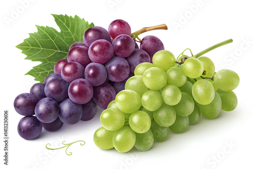 Fototapeta premium Fresh Green Grapes with Leaf on White Background – Organic Fruit, Realistic...