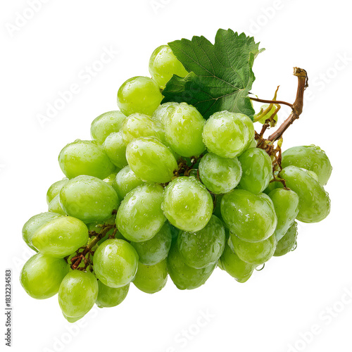 Naklejka premium Fresh Green Grapes With Water Droplets on a Vine Against a White Background