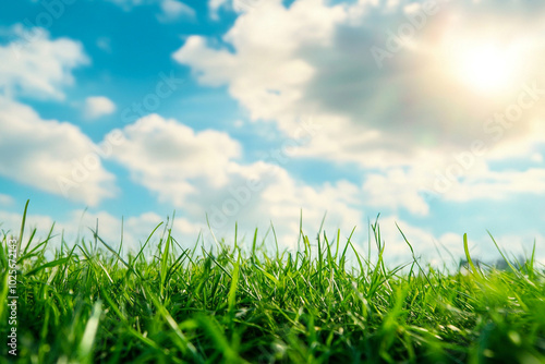 © Emongrapic, Fototapeta premium Fresh Green Grass and Blue Sky Horizon: Tranquil Outdoor Nature Scene