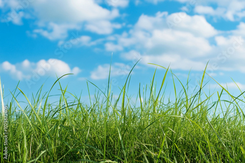 © Emongrapic, Fototapeta premium Fresh Green Grass and Blue Sky Horizon: Tranquil Outdoor Nature Scene