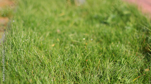 Fototapeta premium Fresh green grass, banner design. Spring season. Photo with copy space
