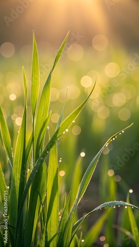 © Hamza, Fototapeta premium Fresh Green Grass Blades With Dew Drops In Morning Sunlight On Natural Outdoor Field Background In Beautiful Spring Season