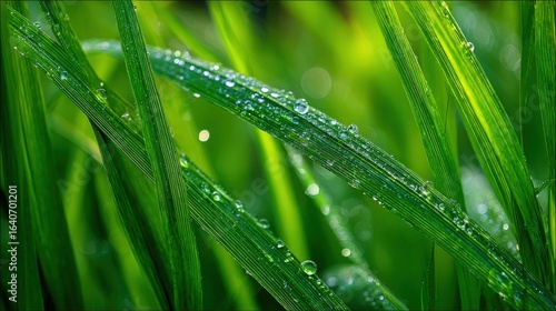 © Generative AI, Fototapeta premium Fresh Green Grass Blades with Sparkling Dew Drops in Morning Sunlight - Close-up Nature Scene