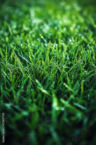 Fototapeta premium Fresh Green Grass Blades with Water Droplets Macro Lawn Detail