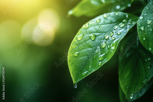 © Ahapen, Fototapeta premium Fresh green leaf with water drops. Natural leaf with dew drop, closeup of wet tree foliage, spring nature background with raindrops