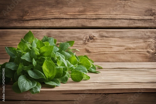 © Jobayer, Fototapeta premium Fresh green leaves and herbs on a wooden table illuminated by natural sunlight close-up photography of nature and organic plants