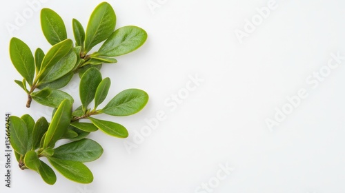 © Asayamrad, Naklejka premium Fresh green leaves arranged on a pale background, showcasing a natural and minimalistic aesthetic.