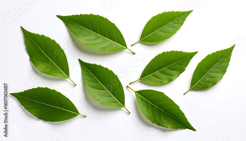 Fototapeta premium Fresh green leaves arranged on a white background