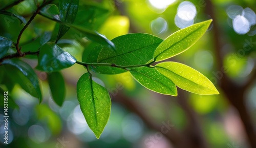 © Photique, Obraz premium Fresh green leaves in sunlight, creating a tranquil and vibrant nature scene.
