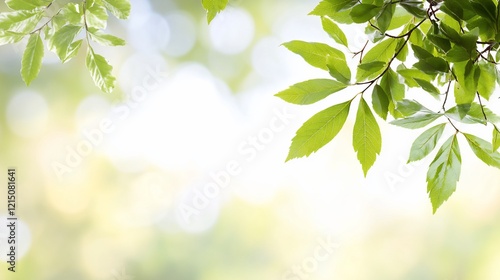 Obraz premium Fresh green leaves, sunlight bokeh, nature background, spring