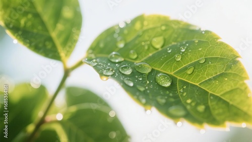 Fototapeta premium Fresh Green Leaves with Dew Drops in Morning Light