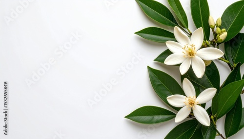 Fototapeta premium Fresh Green Leaves with Fragrant Flowers on White Background