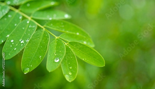 © lembar, Fototapeta premium Fresh green leaves with water droplets (1)