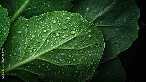 Fototapeta premium Fresh Green Leaves with Water Droplets Close-Up