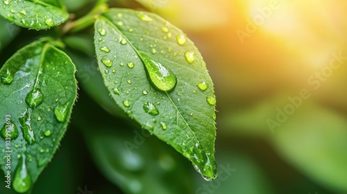 Fototapeta premium Fresh green leaves with water droplets shining in the sunlight.