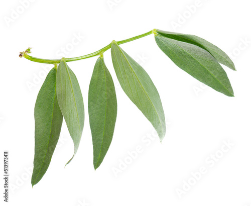 © vandycandy, Obraz premium Fresh green leef of broad beans isolated on white background. Top view.