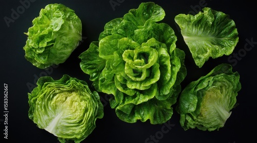 Fototapeta premium Fresh green lettuce heads and leaves arranged artfully against a dark backdrop