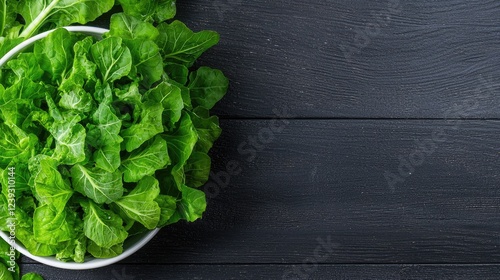 © BROPRADANA, Fototapeta premium Fresh green lettuce in bowl, wood background, healthy food, recipe