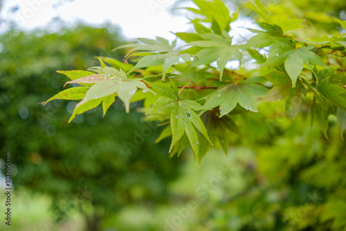 © Kazutaka, Fototapeta premium Fresh Green Maple Leaves in a Tranquil Garden