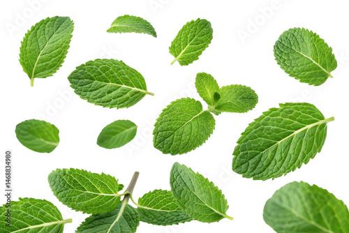 © kiatipol, Fototapeta premium Fresh Green Mint Leaves Falling Isolated on White Background