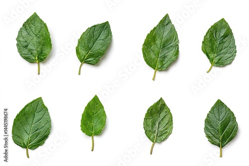 © Momena, Naklejka premium Fresh Green Mint Leaves Pattern on White Background, Macro Shot of Natural Texture