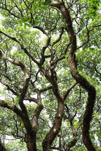 © susansam90, Fototapeta premium Fresh green old tree branches foliage on a bright day light.