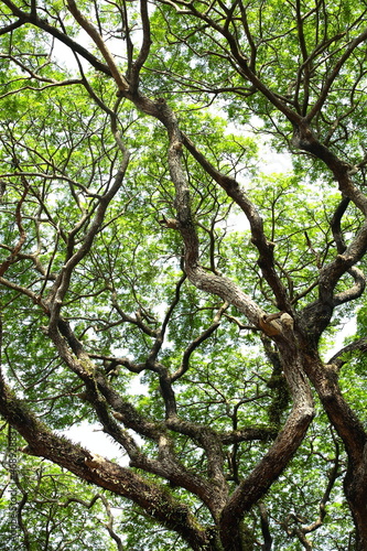 © susansam90, Fototapeta premium Fresh green old tree branches foliage on a bright day light.