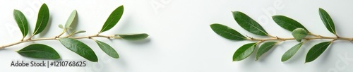 Fototapeta premium Fresh green olive branch leaves spread on a white surface with subtle texture...