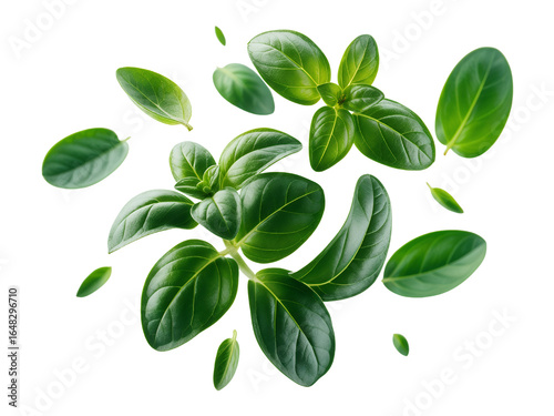 © Anh, Fototapeta premium Fresh Green Oregano Leaves Floating on White Background