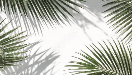 Obraz premium Fresh green palm fronds cast delicate shadows on a bright white backdrop,...