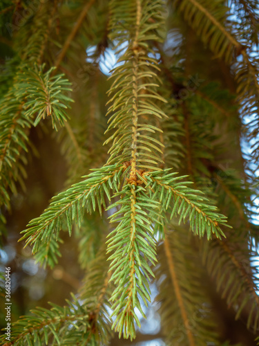 © Dimitrius, Fototapeta premium Fresh green pine needles on a pine tree - closeup shot