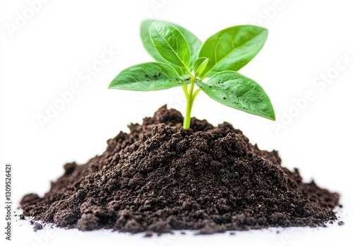 © ANUAR, Naklejka premium Fresh Green Plant Emerging from Rich, Dark Soil Signifying Growth, Renewal, and Sustainable Agricultural Practices in Isolated White Background