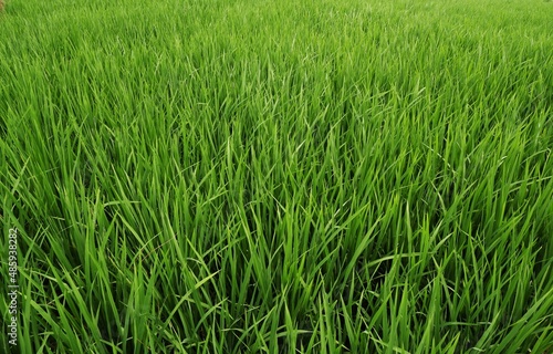 © Syaradin, Obraz premium Fresh Green Rice Field in Metro, Lampung, Indonesia. Wonderful Indonesia. Beautiful Green Background