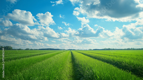 Fototapeta premium Fresh green rice growing in a field under a bright sky. Agricultural landscape