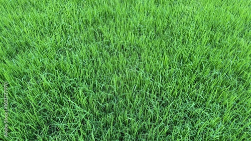 Obraz premium Fresh green rice paddy plants fully covering the field create a calming, natural scenery