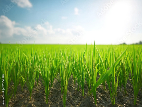 © Keopaserth, Fototapeta premium Fresh green rice plants growing in sunny field under blue sky. vibrant landscape showcases beauty of agriculture and nature bounty