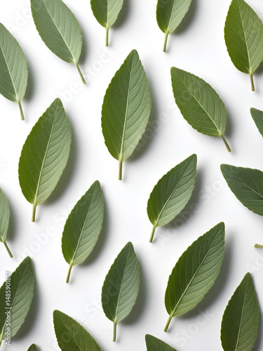 Fototapeta premium Fresh green sage leaves arranged neatly on a white surface for culinary use and decoration