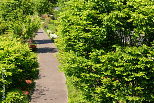 Naklejka premium Fresh green season, promenade. 新緑の季節、遊歩道。
