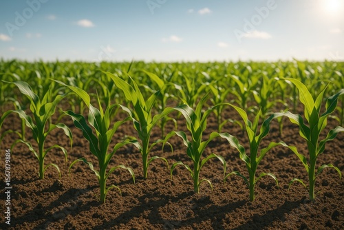 © TheWaterMeloonProjec, Obraz premium Fresh green shoots in a sunny agricultural landscape