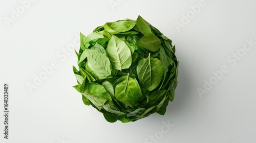 © backup_studio, Obraz premium Fresh green spinach leaf top view forming a sphere on a white background for healthy eating and vegan food concepts.