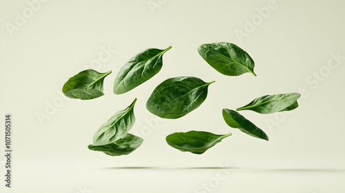 Naklejka premium Fresh green spinach leaves floating in mid-air against a white background.