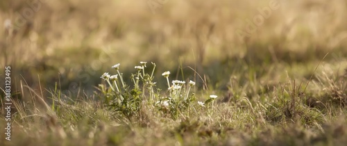 © The 2R Artificiality, Fototapeta premium Fresh green sprouts and small wild flowers in the dried grass