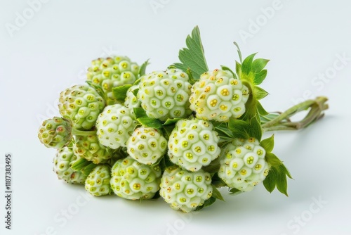 Fototapeta premium Fresh Green Strawberry Cluster Isolated Against a White Background