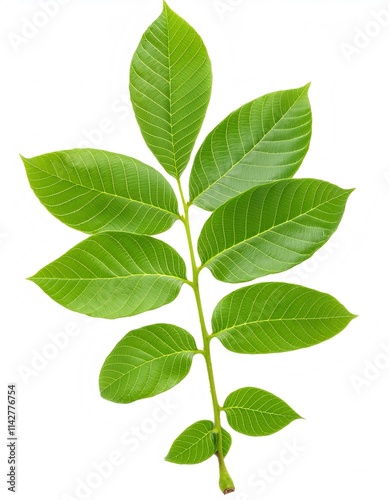 Fototapeta premium Fresh green walnut leaves hanging on branch, white isolated background, sharp...