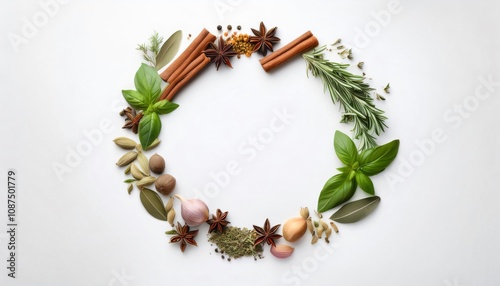 Fototapeta premium Fresh herbs and spices arranged in a circle on a white background, offering a...