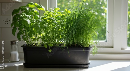 Fototapeta premium Fresh Herbs Growing in a Modern Kitchen Window with Natural Light, Basil, Chives, and Dill in Planter for Culinary Inspiration
