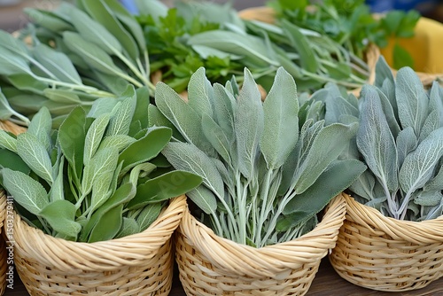 Obraz premium Fresh Herbs in Baskets at a Farmers Market