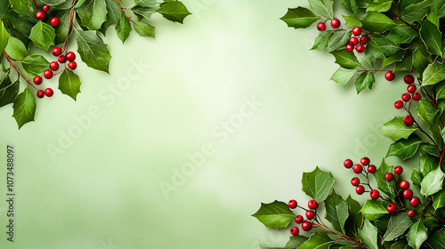 © wannapong, Fototapeta premium Fresh Holly Leaves with Red Berries on Green Background