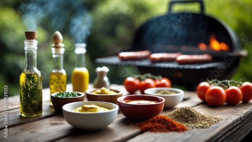 © Sona, Fototapeta premium Fresh ingredients and spices arranged on a wooden table in front of a barbecue grill, ready for cooking.