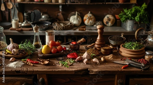 © AssanAI.Studio, Fototapeta premium Fresh Ingredients and Spices on Wooden Rustic Kitchen Table